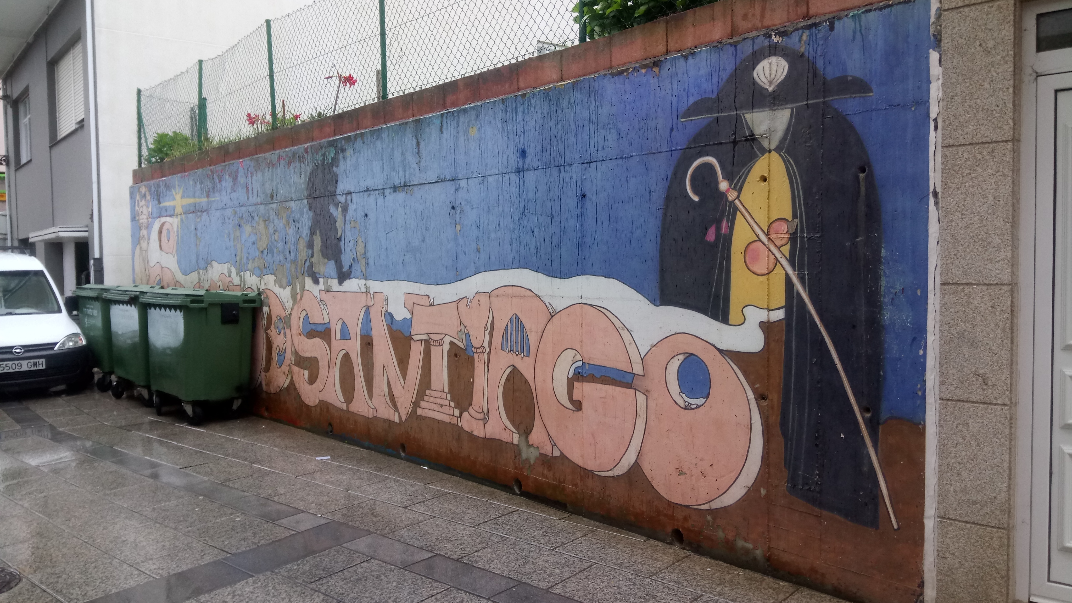 Somewhat dilapidated mural, showing text ‘Santiago’ with a figure of a saint at one end, a silhouette of a walker in the middle, and a medieval pilgrim at the other end