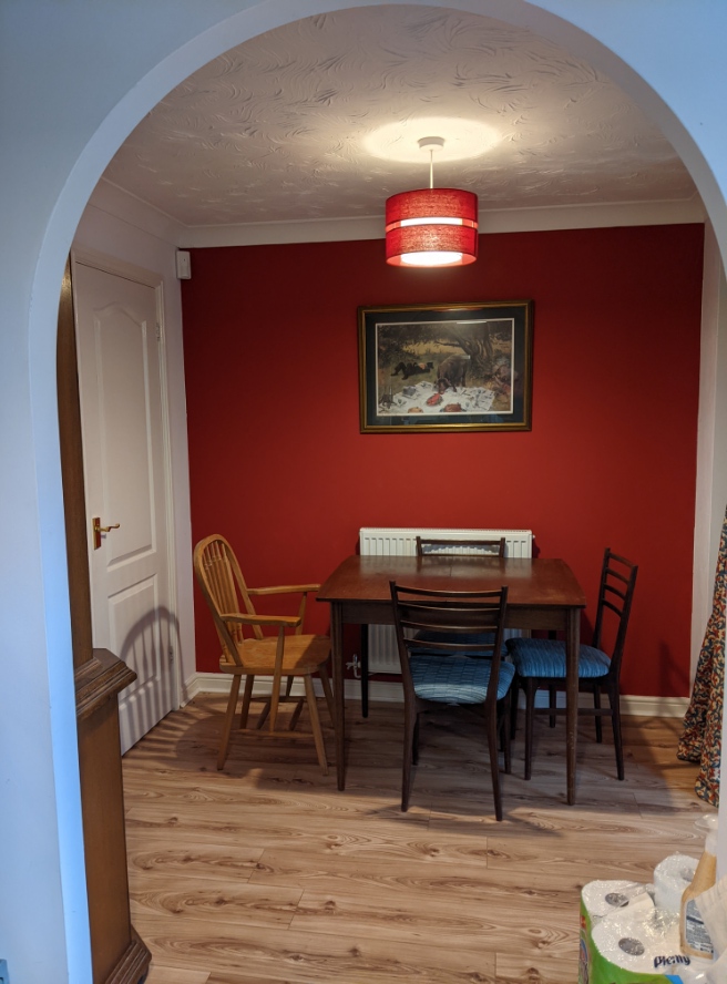 With all that, it became obvious pretty quickly that the dining room wall – an insipid lavender when we moved in – needed to be red. We bought a pot of paint in our first week, on 17 March. We painted the wall on 25 May, bank holiday Monday.