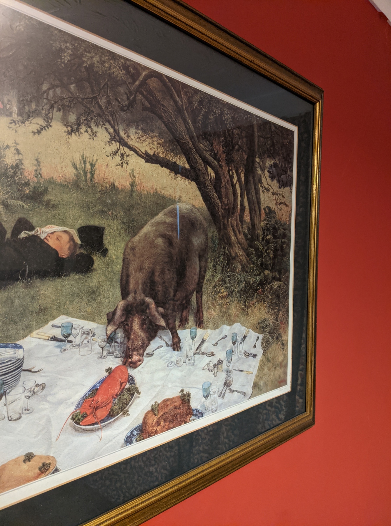 Then there was the pig picture, inherited from my beloved godmother Héloïse. Her house used to be full of vibrant, mischievous pictures: this was my favourite. And there, at the middle of it, is that bright red lobster.
