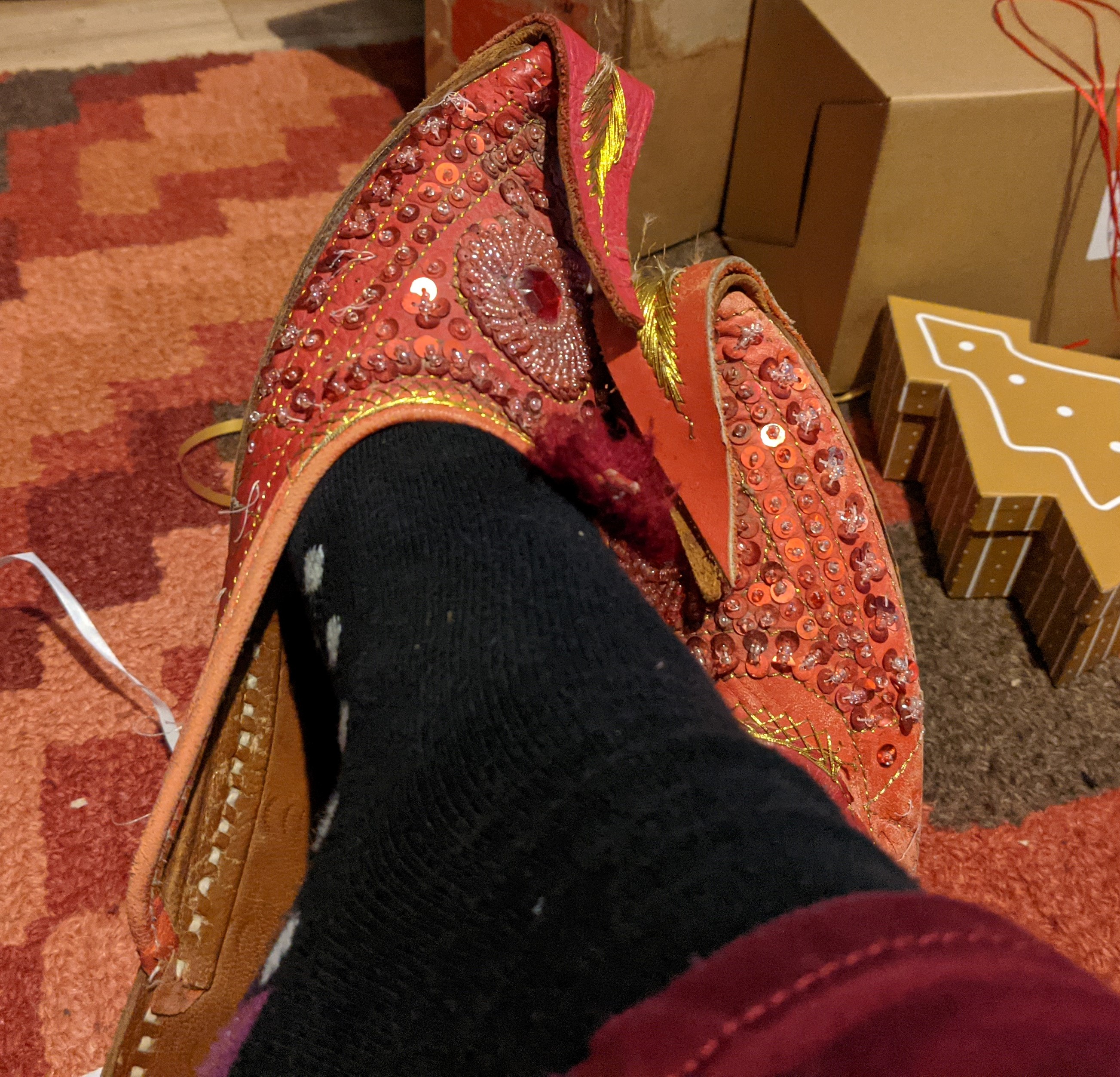 I am not a great one for slippers. I generally go barefoot, assuming it’s warm enough; slippers are more a way to save my socks when it’s not. I’ve tended to find fluffy moccasins too sweaty (it came as something of a revelation when I tried wearing them with socks and found them deliciously cosy). The ones shown here – purchased, as best I can remember, at a car boot sale in Exeter some time in the early 2000s – are spectacular; they’re also a little too small for me, so that the ends of my heels hang off the back, and the soles are a little slippery on tiles. Nevertheless. I don’t think I’m ever going to find the perfect pair of slippers for me, so I’m going to enjoy the imperfect ones.