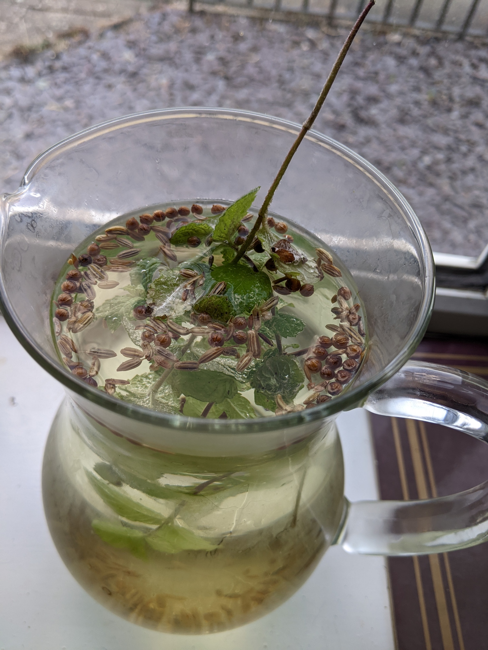 A recommendation from a colleague: water chilled with mint (or cucumber, but we have mint), coriander seeds, fennel seeds, and cumin seeds. It’s pale green, tastes faintly of liquorice, and really does have a cooling effect. More so than plain water? I don’t know. It’s certainly more interesting. I recommend pouring it through a tea strainer.