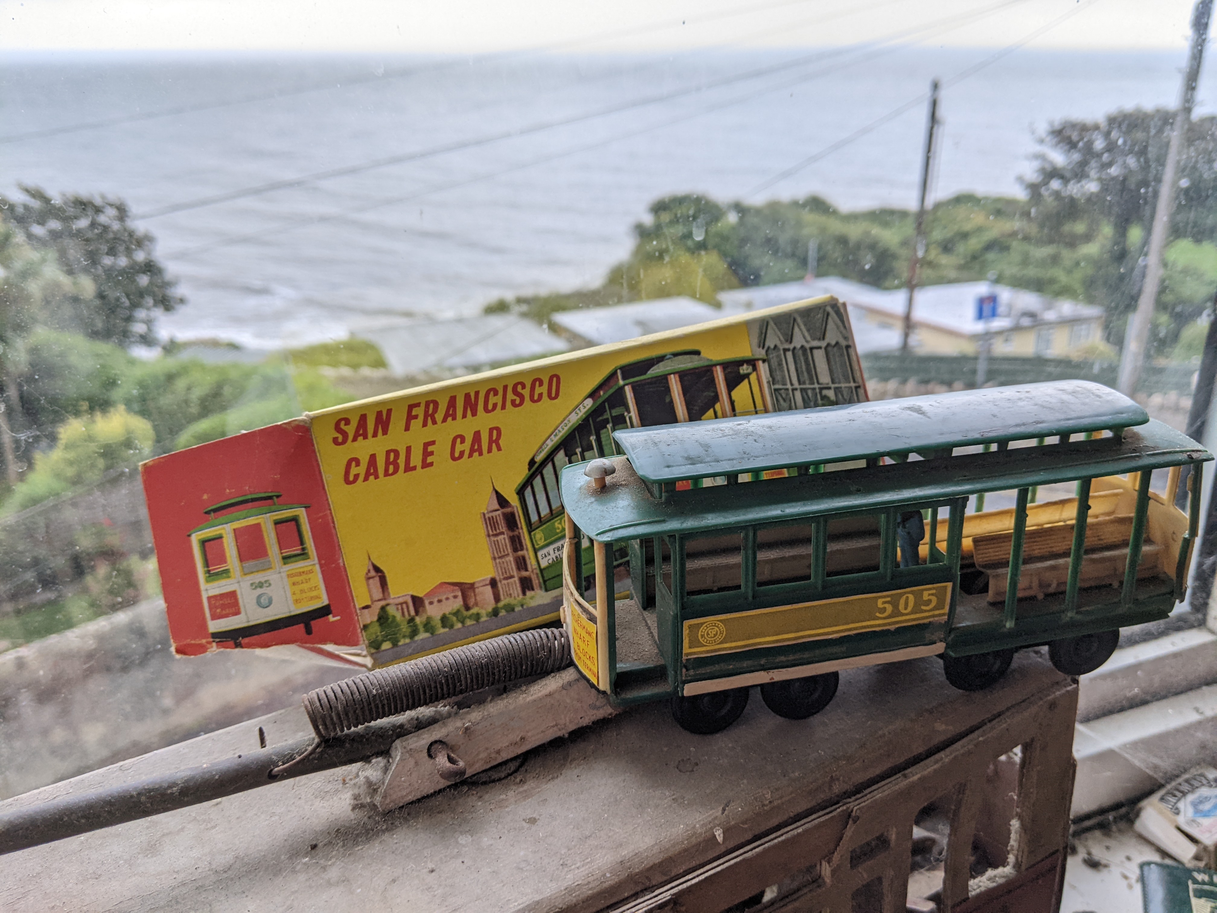 And because regular Island weekends with family tend to mean clearing my father’s house, we’ve been doing that, and it’s slow going. Yesterday I was close to despairing. Today I took a load of shelves to bits and felt better. But yes, it’s not an easy process. Often aggravating. Occasionally poignant. Sometimes hilarious. We found a little card on which was recorded my first visit to a pub. I was less than a month old. And I have to say that should I have need of a 1950s model San Francisco cable car (this will become relevant later), I have a far greater than average chance of finding one.
