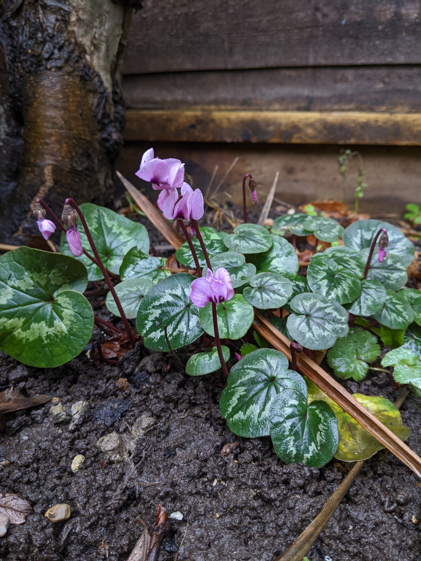 In the garden, the cyclamen have bloomed: sturdy stems, delicate mauve flowers shaped like fantastic head-dresses springing from a rolled band, more outlandish than you’d see in any nativity play. I planted them under the most troublesome of the apple trees, hoping to introduce a little colour against that gloomy fence if nothing else. Suddenly, I’m vindicated.
