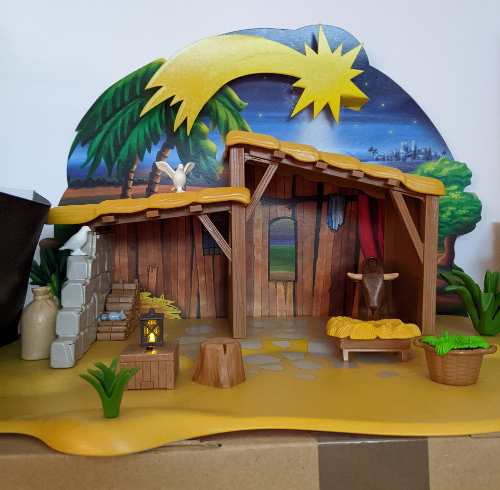 The crib is out. Half the figures aren’t in it yet, of course: all the humans, and the donkey, camel, and sheep, are dispersed around the bookcases, making their way there at their own pace. The angel and the baby Jesus are still in the box.